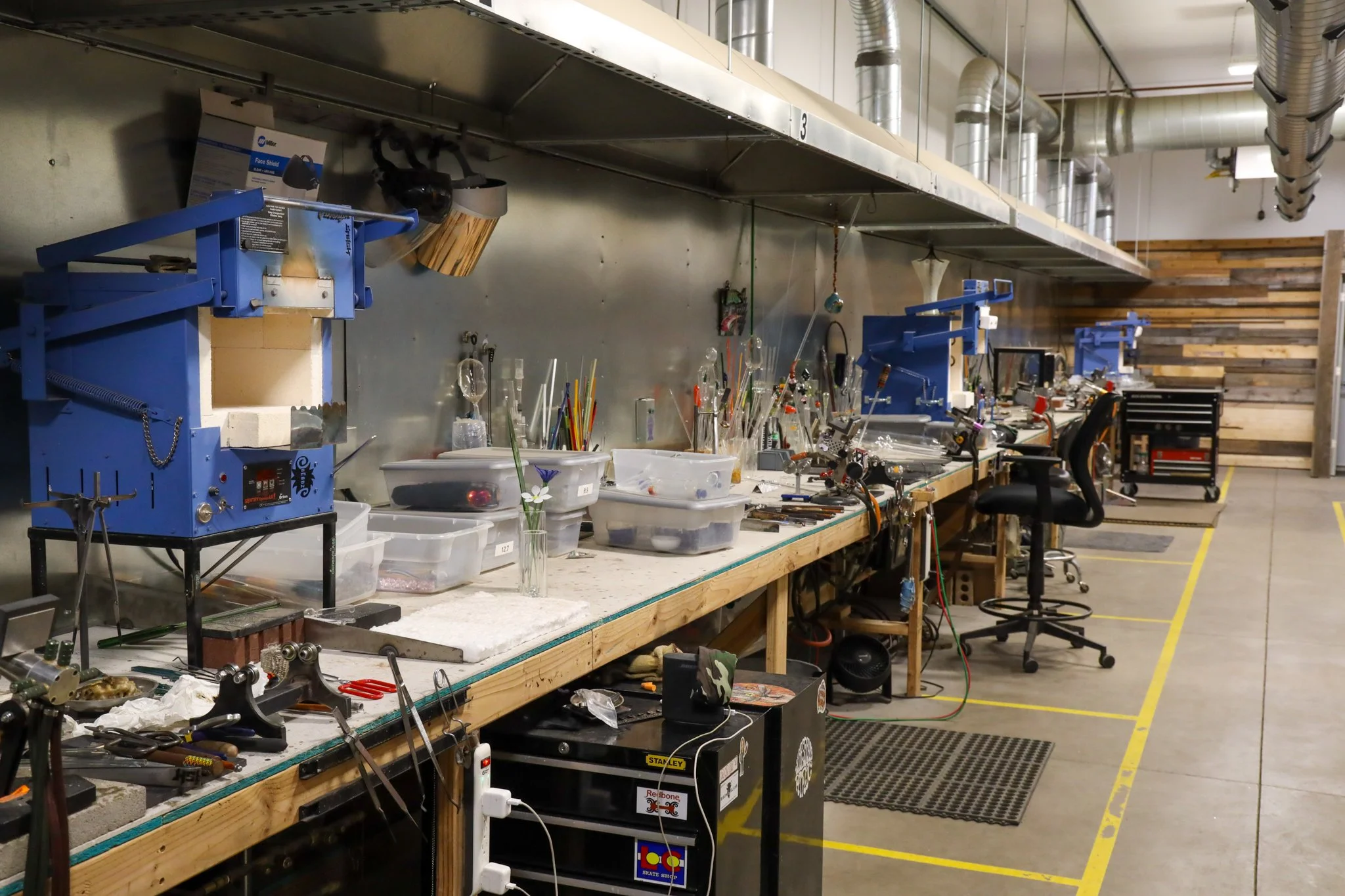 We offer monthly glassblowing bench rentals for artists who want to work alongside a creative, supportive community. Each spot includes propane, oxygen, and compressed air hookups. Artists must have their own torch and tools, and either have prior glassblowing experience or have completed a beginner class at RMAC.